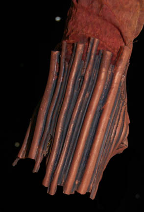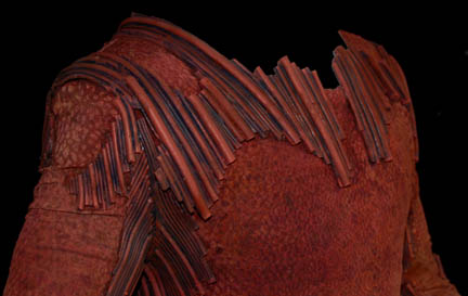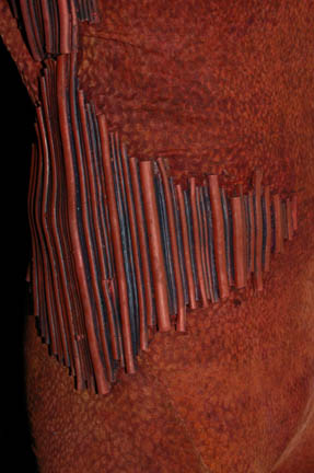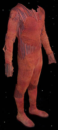 Description: A costume featured in various episodes of Star Trek: Enterprise like “Broken Bow”, “Cold Front”, and “The Expanse” for wear by actors portraying members of the genetically enhanced Suliban Cabal. The costume is a rust colored full length form fitting jumpsuit with multiple latex accents at the cuff, knees, elbows, waist, and across the chest. The costume zips up the back and has attached shoes. The costumer's tag reads ‘Enterprise, Suliban, Steven Lambert’. The zip in the back is unattached to its corresponding piece and thus only clasps at the top.