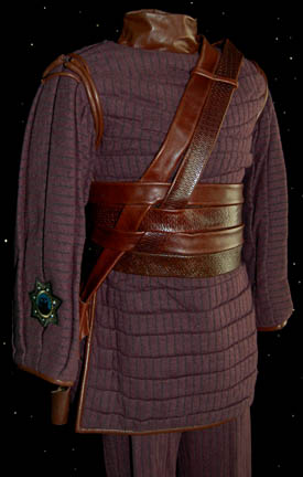 Description: The Tandarans are a humanoid race at war with the Suliban Cabal during the Enterprise series and were featured in the Enterprise episode “Detained”. This is a Tandaran costume that includes a long mauve woolen top with upwards facing pleats and padding. There is brown piping around the shoulders and down each side with slits at the bottom. On the right sleeve is a Tandaran seven-pointed star emblem. Worn underneath is a black padded dickie with a brown faux leather collar. The accompanying pants are made of the same mauve material with black suspenders. An impressive harness completes the costume, made of different patterns of brown leather interlaced and with a built in gun holster. Costume comes complete with costume tag.