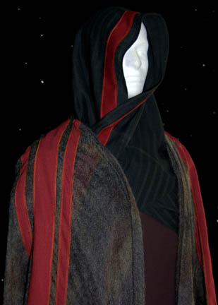 Description: This costume was worn by one of “Zobral's” (Clancy Brown) clan in the Star Trek: Enterprise episode “Desert Crossing” in which Zobral was the leader of a rebellion against the oppressive ruling Torothan clan on their homeworld. The costume includes black parachute pants, a black short sleeved ribbed top, a sheer woven black and green fatigue robe with red stripes down the sleeves and a black hood with red trim. The sewn in ‘Enterprise’ tags indicate this costume was worn by different actors throughout the Enterprise series.