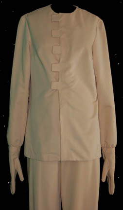 Description: This item is a pair of surgeon's scrubs similar to the ones Dr. Phlox wore in the pilot episode of Star Trek: Enterprise, "Broken Bow". The costume is a velvety tan jacket with attached gloves that buttons, and seals with Velcro down the front along with a pair of matching pants with attached "shoes". The sewn in tag reads "Susan Foley" and the costumer's tag reads "Enterprise, Susan Foley, #721".