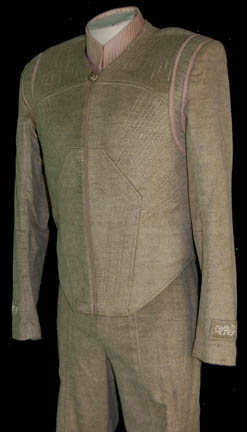 Description: The Vissians are a race encountered by the U.S.S. Enterprise NX-01 in the Star Trek: Enterprise episode “Cogenitor”. Their race includes a third gender called the “Cogenitors” who are treated as objects, being passed around from one Vissian couple to another. This Vissian costume includes a soft faux fur jacket with intricate stitching for detail, tan piping around the shoulders, Vissian designs on the cuffs and a metal button embellishment sewn onto the zip. A sleeveless beige suede shirt is worn underneath with a stitched detail collar. The accompanying pants are also faux fur with detailed stitching for decoration. A small bag of extra metal buttons is also included. Costume comes complete with costume tag.