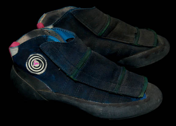 Description: A costume featured in Star Trek V: The Final Frontier for wear by William Shatner during his portrayal of “Captain Kirk” during opening scenes as he was climbing ‘El Capitan' in Yosemite National Park. The costume is made up of a black trousers with neon green piping flairs below the knee, and a purple sweater with orange piping and an orange collar in the front and back of the neck with a minute amount of distress in the front. The lot also comes with black colored climbing shoes with the ‘Boreal’ name brand inscribed on the sole, a flap that covers the laces by way of snaps and Velcro and a costumer’s tag indicating the shoes are for blue screen use. The costume features a black nylon climbing belt with a silver colored metal buckle, a black Carabiner with a silver colored screw lock, and a red nylon chalk bag with a draw string seal. The costumer’s tag reads ‘Star Trek V, William Shatner as Capt. Kirk CHG #1’ and the sewn in tag inside the trousers reads ‘Shatner, blue screen’. Due to time and storage conditions the orange element in the sweater shows signs of settled dust.
