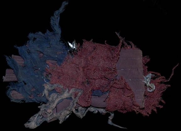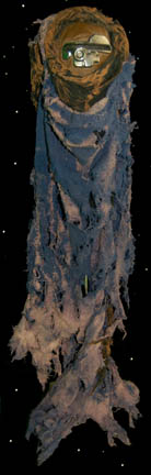 Description: A costume lot featured in Star Trek II: The Wrath of Khan for wear by Fletcher Bryant in his portrayal as one of “Khan's” (Ricardo Montalban) genetically engineered henchmen. The costume is a trio of shirts in various states of distress, one being a stunt double shirt, all of them with a black colored tattered wrap. A leather harness with a dulled metallic silver colored resin buckle is present for wear across the chest, as are brown leather boots covered with affixed rags, a single glove made to match the boots with a disconnected but accompanying claw, and a pair of distressed to appear stained gloves, colored tan with padding to appear futuristic and spacey. The costume also includes a leather face mask with a metallic silver colored plastic ‘eye piece’ with a slit cross the eyes with attached rags for wear over the costume when the character was on expeditions outside of the crashed “SS Botany Bay”.