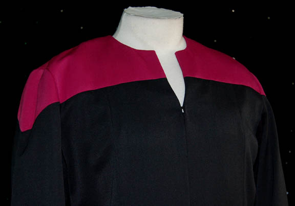 Description: A costume featured in Star Trek VII: Generations for wear by Patrick Stewart in his role as “Captain Picard”. The costume is a black Starfleet uniform jumpsuit with command red division shoulders, a form fitting elastic waist, and an accompanying plum colored sleeveless undershirt with sewn in muscular padding. Both garments feature sewn in tags, the jumpsuit reads ‘Star Trek TNG Patrick Stewart' while the undershirt reads ‘Star Trek VII Patrick Stewart’.