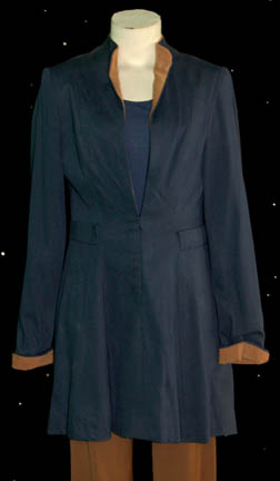 Description: A costume featured in Star Trek IX: Insurrection for wear by Gates McFadden in her portrayal of “Dr. Beverly Crusher”. The costume is a pair of brown trousers with a light draping long sleeved shirt colored blue and a corresponding blue jacket with a tan interior lining. The costumer's tag reads ‘Dr. Crusher, Change No. 3, 135-end, STAR TREK IX, post cave collapse’.