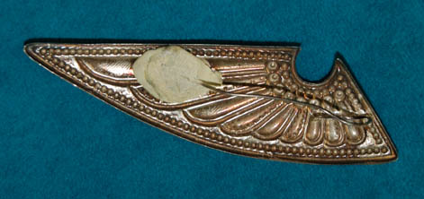 Description: A piece of costume jewelry acquired for use in Star Trek feature films or episodic television that is wing-shaped, made with a metal pin affixed to the back to attach to a costume measuring approx.3.75 X 1 inch.