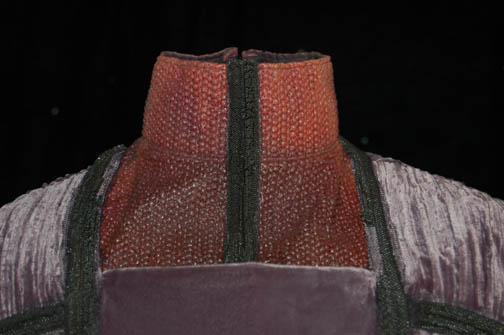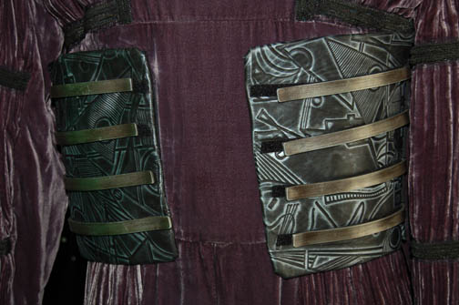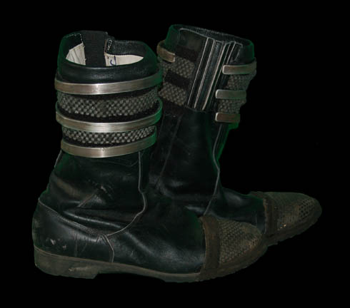 Description: The ‘Tarlac' were a primitive race that appeared in the Star Trek: Insurrection feature film as the indentured servants to the more powerful ‘Son’a’. This jumpsuit was worn by a Tarlac officer serving on board the Son’a “Ru’afo’s” (F. Murray Abraham) flagship. Made of purple velvet, the jumpsuit has black rubber capillary detail strips around the arms and body. There are also Velcro areas on each side of the waist where metal ribs mounted on silver vinyl attach. A mottled brown dickie worn under the jumpsuit is also included. Black boots with capillary rubber trim accompany the costume. Each boot comes with three egg shaped rings that are designed to go around the top. In some cases the rings have come loose and may need to be reattached with glue.