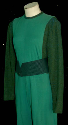 Description: A costume featured in Star Trek VII: Generations for wear by actors portraying waitresses in Ten Forward of the “USS Enterprise-D”. The costume is a full length green hued jumpsuit with a green vinyl belt and green woven sleeves. The sewn in tags read ‘Victoria Cameeron, Judie Pimitera'.