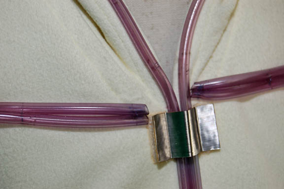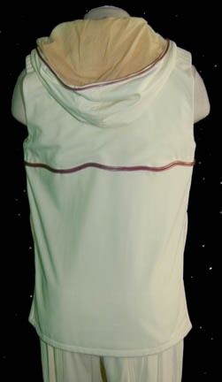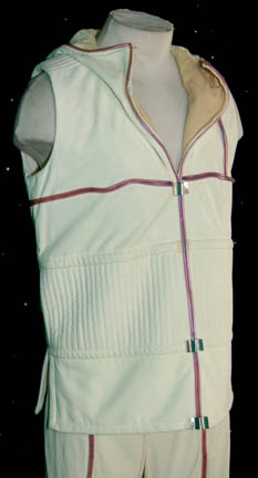 Description: A costume featured in sickbay sequences of Star Trek I: The Motion Picture. The costume is an off-white, sleeveless, hooded shirt featuring purple plastic piping down the front, along the trim, and faded tan fabric inside. The corresponding trousers have similar piping with Velcro size adjustment on the ankle cuff.