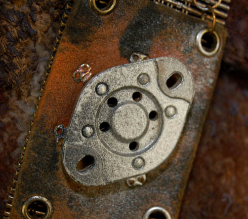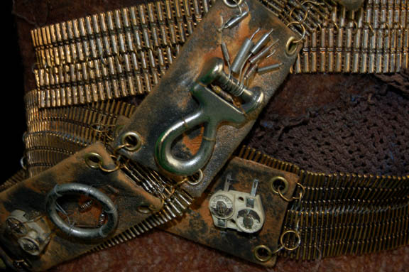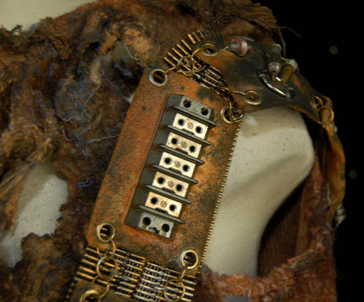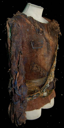 Description: “Khan” (Ricardo Montalban) was a legendary genetically-engineered Human augment who starred in the acclaimed Star Trek II feature film, The Wrath of Khan. He and his crewmen escaped exile from the desert planet, “Ceti Alpha V” and strove to inflict revenge on “Admiral Kirk” (William Shatner) who stranded him and his crew there years before. This top and harness was worn by one of Khan's crewmen onboard the U.S.S. Reliant and includes a knitted brown top with woven parts attached to it and a braided left sleeve. It is intentionally distressed to give it an old weathered look. The impressive harness is made of metal links with suede rectangular pieces attached at intervals along it. The suede has an assortment of metal and electrical components wired to it including fuses, resisters and wire coils. It appears that this costume was later reused on the Star Trek: Voyager episode “The Chute” by “Rib” (Beans Morocco) who was an “Akritirian male inmate.