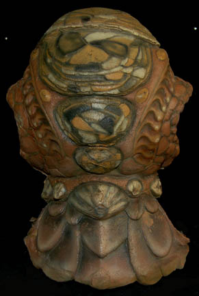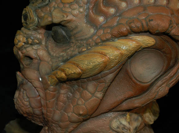 Description: This incredible piece of art is a complete Kolaran head from the Star Trek: Nemesis feature film. Although made of latex, this bust appears not to have been intended for use as a mask since it has been permanently attached to the supporting foam interior that helps it maintain its form. The eyes also have not been cut out, another indication that this was not intended to be an actual mask. That said the detail with which this piece has been made is exceptional. The subtle lines and grooves give the appearance of reptilian skin and the spray painted surface makes the head all the more lifelike. Measures approx. 15 ½ x 10 ½ x 10 ½ inches.