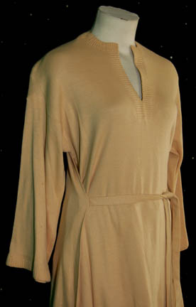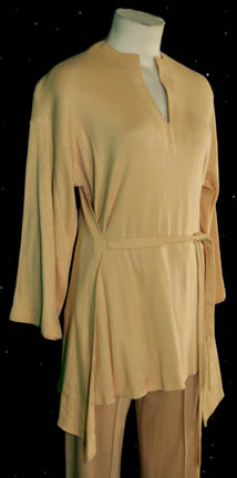 Description: A costume worn in various sequences of Star Trek I: The Motion Picture by off-duty female officers. A light, beige, long-sleeved shirt with ties on the side, textured v-neck collar and cuffs, very minor spotting due to time and storage, and corresponding trousers.