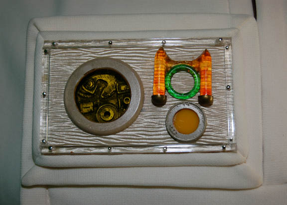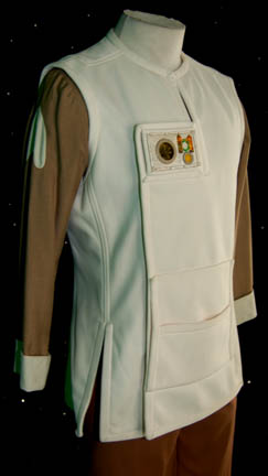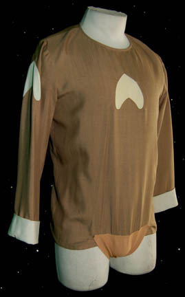 Description: A costume featured in Star Trek II: The Wrath of Khan for wear by “Jedda” (John Vargas), a scientist at the Regula I laboratory during the development of Project Genesis. The costume is a pair of brown trousers with Velcro and clasp size adjustments at the ankles, and a long sleeved shirt with cream colored arrowhead accents on the sleeves with upturned cuffs. The costume also comes with an off-white vest with a side positioned zip and clasp system of enclosures also utilizing Velcro, and a ‘researcher badge' made of textured reflective silver colored backing with multiple translucent plastic and resin details. The vest features a sewn in Paramount tag reading ‘J’ Vargas’ and a pair of circular stains are evident on the back of the item likely due to storage.