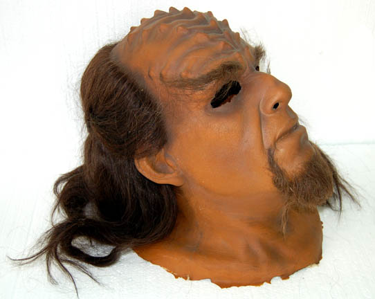 Description: This incredible full head Klingon mask was used in Star Trek VI: Undiscovered Country, during a courtroom scene that involved around 200 Klingons. In order to dress that many actors in Klingon makeup, the background actors in the upper balconies wore these full faced masks to make the process quicker than actually attaching individual prosthetics to their faces. This latex head has been completely painted and airbrushed with hair attached behind the forehead ridges. Facial hair has been added for eyebrows and a two part beard. Under the hair at the back of the head is a concealed Velcro strip to allow the wearer to take the mask on and off more easily. Measures approx. 12 x 7 x 11 ½ inches.