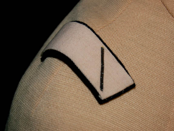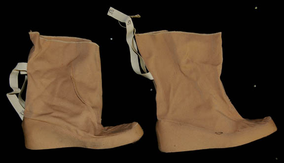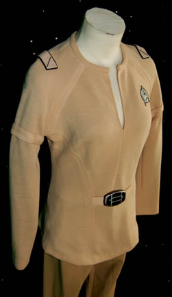 Description: A costume featured in Star Trek I: The Motion Picture for wear by actresses portraying female operations officers. The costume is a tan, long-sleeved, v-neck uniform shirt featuring an attached bio-monitor, affixed white division strips on the shoulders with embroidered gold bars indicating the rank of ‘lieutenant', a Starfleet insignia with silver backing denoting operations division, corresponding shoes and trousers with Velcro and clasp size adjustments on the ankle cuffs.