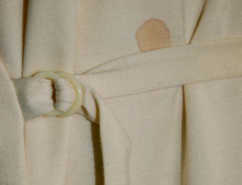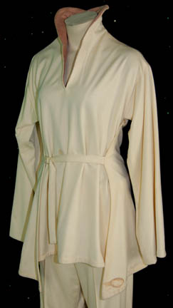 Description: An off-duty tunic from onboard the U.S.S. Enterprise NCC-1701 as featured in Star Trek I: The Motion Picture. It is similar to the one worn by “Lieutenant Ilia” (Persis Khambatta) who was a Deltan from Delta IV and navigator onboard the U.S.S. Enterprise during the V'Ger incident in. It includes a long sleeved cream top has slits up each side that are held closed with a strap that crosses the front and fastens on the right. The V-neck and high collar lining are brown and there is a stylized dip in the back of the collar. There is a brown stain on the front and another on the left hem. The accompanying cream pants also have slight distress to them.