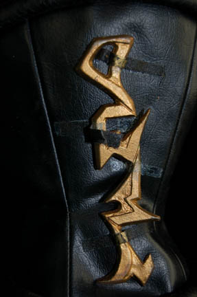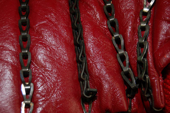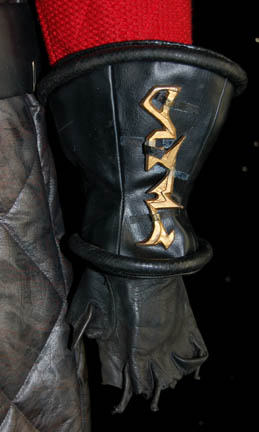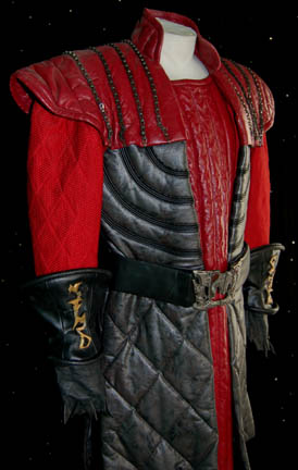 Description: A costume featured in Star Trek VI: The Undiscovered Country for wear by David Warner in his portrayal of “Chancellor Gorkon”. The costume is a pair of Klingon-style gray spandex trousers, a large gray colored vinyl costume jacket with multiple sewn in lines of detail, read leather shoulders with metal chain accents, and red fabric sleeves. The costume also comes with a wide black leather belt with an enormous silver colored metal buckle around with the belt loops to seal to Velcro placements with red colored ‘gems'; the reverse of the buckle is inscribed ‘Gorkon’ in red marker and indicates which way to wear it (also present is a tag reading ‘Scott McDonald’). Also included are a pair of black leather gauntlets with gold colored metal Klingon script badges wired into them, and black leather fingerless ‘claw’ gloves. The jacket is the style which appears on screen, the belt is inscribed ‘Gorkon’, the trousers, gauntlets, and gloves are not verifiably part of the costume and have been included to create a representative uniform.