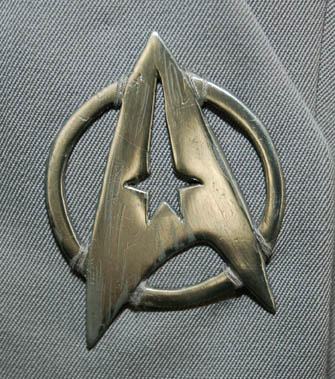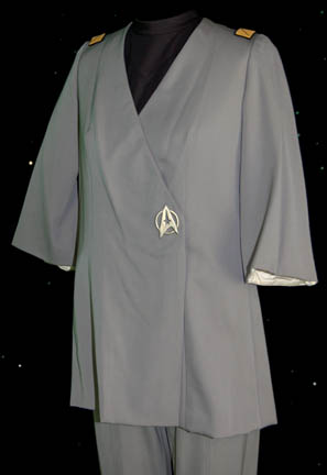 Description: “Lieutenant Ilia” (Persis Khambatta) was a Deltan from Delta IV and navigator onboard the U.S.S. Enterprise during the V'Ger incident in Star Trek I: The Motion Picture. Although she was ‘killed’ by a probe from V’Ger, the almost exact mechanical duplicate of her created by the probe was so real , “Admiral Kirk” (William Shatner) listed her as missing not killed after her involvement with the crisis conclusion. This Starfleet uniform was made for Ilia, however it appears not to have made it into the final cut of the movie. The gray Class-C jacket wrap has a metal Starfleet emblem sewn onto the front and closes with Velcro just left of center. On each shoulder are yellow rank stripes with a single gold bar indicating the rank of lieutenant. Worn underneath is a black dickie with a zip up the back. Gray trousers with built-in shoes complete the uniform. Due to time and storage, there are several tiny holes in the uniform. The sewn in tags in the jacket and trousers read “Paramount – Persis”.