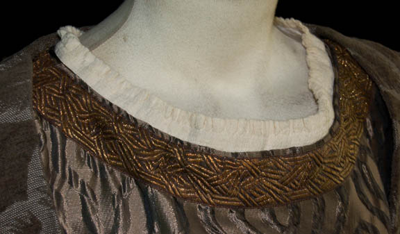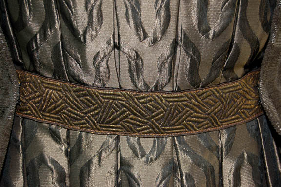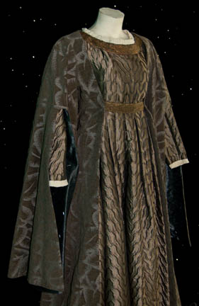 Description: A costume featured in the Star Trek: The Next Generation episode “Thine Own Self” for wear by “Talur” (Ronnie Claire Edwards). When an amnesiac “Data” (Brent Spiner) arrives on an alien world on a mission to retrieve radioactive debris from a crashed probe he encounters a pre-industrial species of which Talur may be the most advanced mind. Her costume is made up of a beautiful dress with alternating gunmetal colored pattern and a sewn on gold pattern strip at the waist with a large over robe with large gray lily print and a black interior lining with rectangular silver colored metal flecks affixed. The two costumer's tags read ‘#268 “Thine Own Self”, Talur, Ronnie Claire Edwards’ and indicate their components.