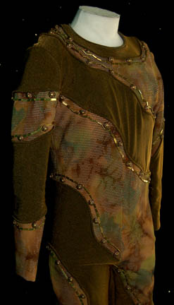 Description: A costume featured in the Star Trek: Voyager episode "Think Tank" for wear by Christopher Shea in his role as “Saowin”, a representative of one of the races that the ‘Think Tank' had assisted in the past. The costume is full size jumpsuit in an iridescent olive fabric and camouflage mesh with gold colored chain accent, copper colored buttons, stirrups for the feet and a zipper going down the back. A sewn in tag reads 'Voyager, Christopher Shea'.