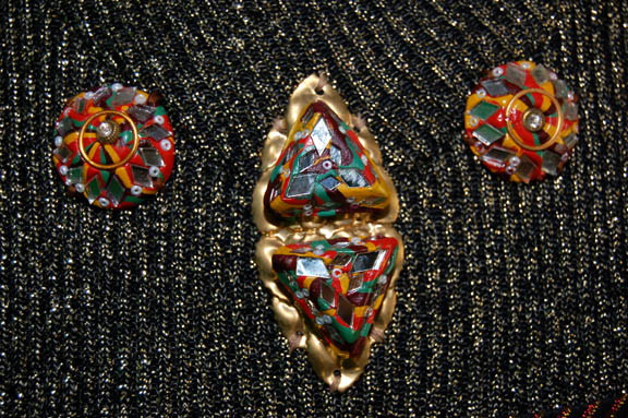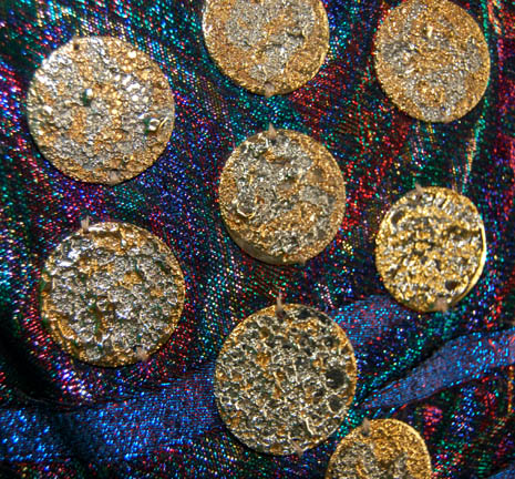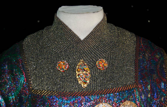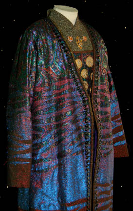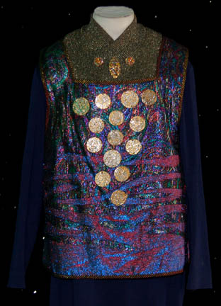 Description: “Kolos” (Tom McCleister) was the alien business partner of “Quark's bar who participated in Quark’s (Armin Shimerman) auction in the Star Trek: Deep Space Nine episode “Q-Less”. He successfully won a Verathan statue but lost out on a dagger. The costume includes a navy knitted jumpsuit, a multicolored metallic vest with metal medallions sewn onto the front and a zip up the back. The impressive robe is multicolored metallic fabric with black and gold trim. The inside of the robe is iridescent mauve with small black velvet ‘V’s attached for detail. Costume comes complete with costume tag.