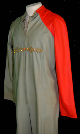 Description: A costume featured on the Star Trek: Voyager episode "Repentance" for wear by F.J. Rio in the role of "Joleg", one of the prisoners on the terminally damaged prison ship for which "Voyager" answers a distress call. The costume is an olive colored sleeve-less mesh shirt and an olive vinyl jumpsuit with orange down one arm, plastic glyphs with working, built-in LED lights, and a zipper down the back that has been distressed to appear like a prisoner's uniform. A sewn in tag reads 'Jim Ortega' and the costumer's tag reads '#259 Repentance Voayager, Joleg Stunt Dbl, Jim Ortega, Jumpsuit, t-shirt'.