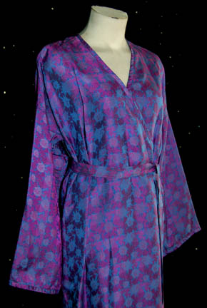 Description: A costume featured in the Star Trek: Voyager episode "In the Flesh" during which Kate Vernon portrayed "Commander Valerie Archer" a member of Species 8472 disguised as a human in a plot to infiltrate Starfleet Command. The costume is a purple long sleeved robe with purple starburst designs, v-neck collar, buttons down the front, and a sash tie around the waist appearing during scenes taking place in her quarters in the intricate illusion. The costumer's tag reads ‘Comm Archer, Kate Vernon’. Vernon has enjoyed success as "Ellen Tigh" on Sci-Fi Channel's new reimagined Battlestar Galactica.