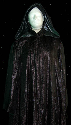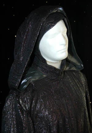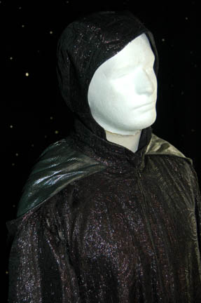 Description: “Joran Dax” (Jeff McBride) was a joined Trill and the sixth host of the Dax symbiont. He was featured in the Star Trek: Deep Space Nine episode “Equilibrium” in which “Jadzia Dax” (Terry Farrell) was plagued by suppressed memories surfacing related to the unsuitable joining of Joran to the Dax symbiont. This multilayered back robe has a glistening pattern within the fabric, a silver lined hood and a matching black patterned skull cap. Costume comes complete with costume tag.