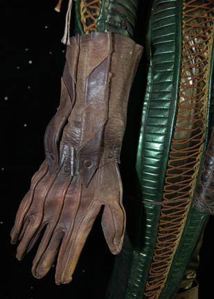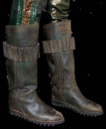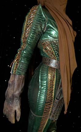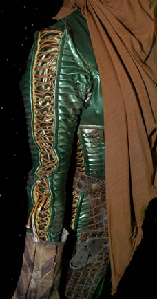 Description: A costume featured in the Star Trek: Voyager episodes “Gravity” for wear by Lori Petty in her role as "Noss", an alien woman with whom "Tom Paris" (Robert Duncan McNeil) and “Tuvok" (Tim Russ) were stranded on a deserted planet. The costume is a green iridescent vinyl jumpsuit with a v-neck, textured and gold colored string accented sleeves, stirrup feet, leather belt, holster, gloves, boots, and a brown cloth head wrap. Sewn in tag reads 'Voyager, Lori Petty' and is distressed to look as if "Noss" had been alone on the planet for years including a diagonal slash across the top of the left thigh.