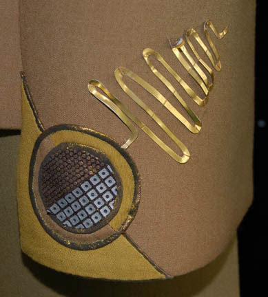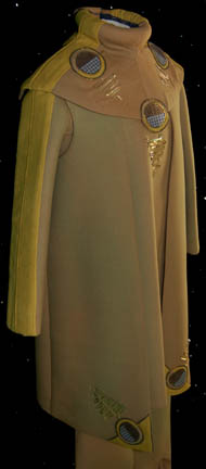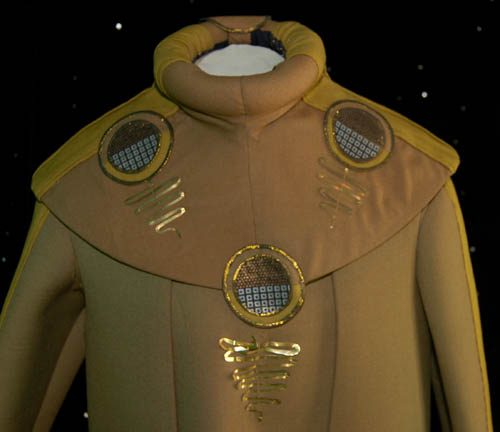 Description: A costume featured in the episode “Unification, Part I” of Star Trek: The Next Generation for wear by “Klim Dockachin” (Garham Jarvis), Zakdorn quartermaster of a Starfleet Surplus Supply depot from which Romulan agents stole Vulcan ships in preparation for an invasion! The costume is an olive green and lime colored outfit with trousers featuring neoprene elements and a neoprene shaped jacket top, and a wide gorget with copper colored metal accents and, metallic fabric details. The costume comes with multiple unused or duplicate details.