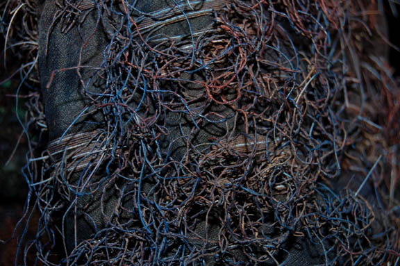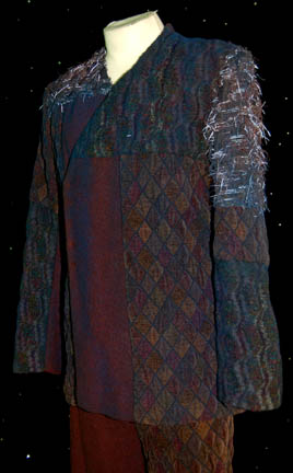 Description: A costume featured in the Star Trek: Voyager episode "Survival Instinct" for wear by Star Trek veteran actor Vaughn Armstrong in the role of "Two of Nine/Lansor". Lansor is one of three former Borg drones that "Seven of Nine" (Jeri Ryan) was once marooned on a planet and separated from the Borg Collective with. The costume is a blue-purple jacket made from several different materials patched together, it has buttons and clasps down the front, corresponding over all type pants in the same patchwork style with stirrups for the feet, and a hand wrap of similar fabric. A sewn in tag in the jacket reads 'Voayger, Steve Cvany' and a sewn in tag in the pants reads 'Voyager, Vaughn Armstrong' whereas the costumer's tag reads '#122 Survival Instincts Voyager, 2 of 9, Vaughn Armstrong, hand wrap included'.