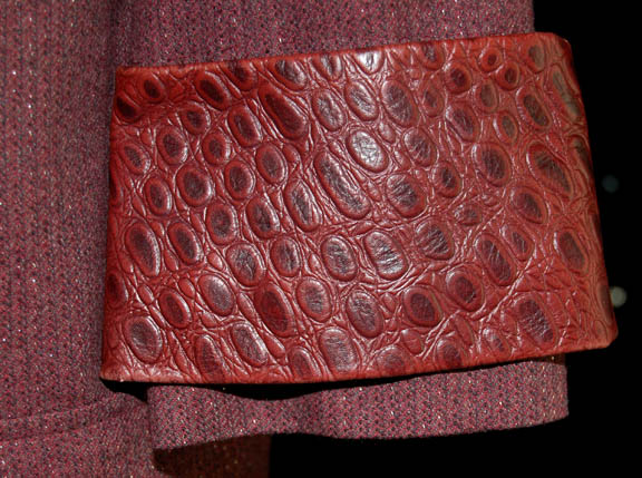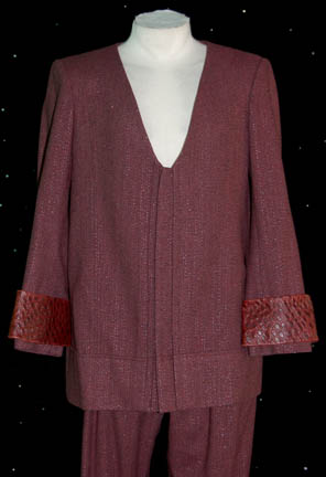 Description: A costume featured in the Star Trek: The Next Generation episode “A Matter of Perspective” for wear by “Apgar” (Mark Margolis). The costume is plum colored trousers with silver thread flecks evenly dispersed throughout the fabric and a matching jacket top with a lot V-neck and a snap front, with a brown leather belt. The costumer's tag reads #162, TNG “A Matter of Perspective”, Apgar, Mark Margolis’ and indicates the components.