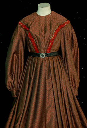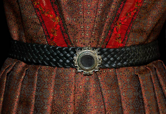 Description: A costume featured in the Star Trek: Voyager episode "The Q and the Grey" for Susie Plakson in her role as the “Female Q” who mates with “Q” (John De Lancie) to stop a Q Continuum civil war. The costume is a cotton under dress, with an over dress of intricate circular decoration, red brocade going down the front, and a leather girdle with faux jewel in the middle. Sewn in tag reads 'Voyager, Susie Plakson'.