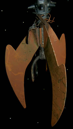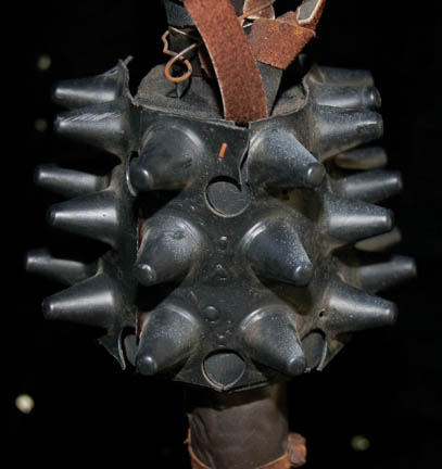 Description: A prop weapon appearing on the wall in scenes from the Star Trek: Voyager episode "Flesh and Blood" where the holograms the Hirogen used for hunt training turned on them and massacred their masters. The weapon is a staff wrapped in leather strap, with plastic spikes on the handle leading to three huge metal ‘blades' leading out of the shaft and three smaller pitchfork-type ‘blades’ in the middle. The strapping is starting to unwind and one set of spikes is beginning to come off. The item measures 45 X 1.5 inches.