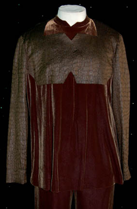 Description: A costume featured in the Star Trek: Voyager episode "Ashes to Ashes" for wear by Kevin Lowe in the role of “Qret”, the father of "Jhet'laya", an alien who is masquerading as "Ensign Lindsay Ballard (Kim Rhodes), a “Voyager” crewmember who died. The costume is a shirt of velvet and a brown textured fabric, a faux undershirt sewn in, a zipper down the back and corresponding brown velvet pants wit stirrups for the feet. A sewn in tag reads 'Chandler Hill' and the costumer's tag reads '238 Ashes to Ashes Voyager, Qret, Kevin Lowe'.