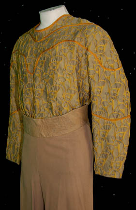 Description: A costume featured in the Star Trek: Voyager episode "Hope and Fear" for wear by Ray Wise in his role as "Arturis", an alien who convinces the crew of “Voyager” to believe that Starfleet has sent a newer, faster ship to get them home. The costume is a long sleeve olive shirt with intricate yellow brocade, zipper up the back, khaki corduroy pants, and a tan leather belt. Costumer's tag reads '194 Hope and Fear Voyager, Arturis, Ray Wise'. Wise also appeared in the hit television series “Twin Peaks”.