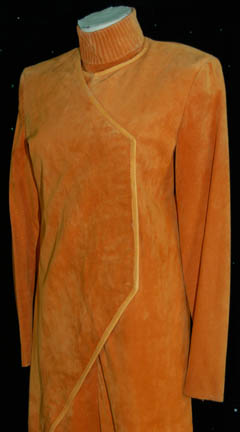 Description: A costume featured in the Star Trek: The Next Generation episode “The Outcast” for wear by “The J'naii Leader” (Laura Granick). The costume is an orange suede jumpsuit with an asymmetrical front zip involving Velcro. The costume features an dickie with a pleated collar and comes with a costumer’s tag reading ‘#217 “The Outcast” J’naii leader, Laura Granick’.