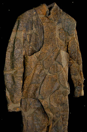 Description: A costume featured in the Star Trek: Voyager episode "Blood Fever" of an alien species called the "Sakari" that were all but wiped out. The costume is a tan jumpsuit and over harness made to emulate the surface of the rocks and soil found in subterranean tunnels as some sort of camouflage. It has been distressed for appearance. A sewn in tag reads 'Voyager, Ted Barba'.