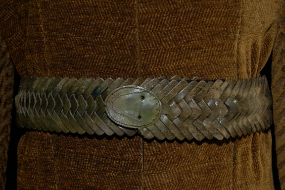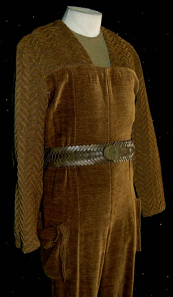 Description: A costume featured in the Star Trek: Voyager episodes "Dark Fronier I & II" for wear by Kirk Bailey in the role of "Magnus Hansen", father of "Annika Hansen/Seven of Nine" (Jeri Ryan), where Seven is deceived into rejoining the Borg Collective and the "Voyager" crew mounts a rescue attempt. The costume is an olive colored woven undershirt, a light brown jumpsuit with textured fabric on the sleeves, functional pockets on the legs, a zipper down the front, stirrups for the feet, and a lattice-weave, leather belt. A sewn in tag reads 'Voyager, Clayton Storseth' and the costumer's tag reads 'Voyager #211 Dark Frontier, Magnus, Kirk Bailey'.