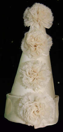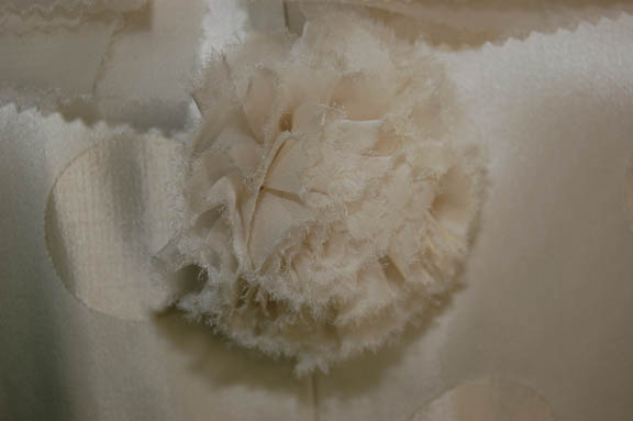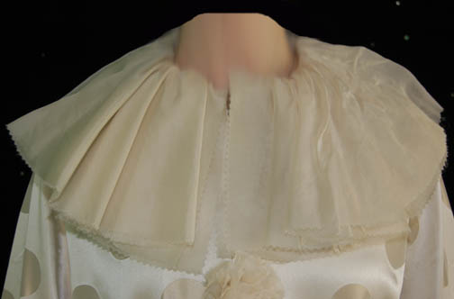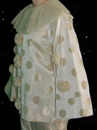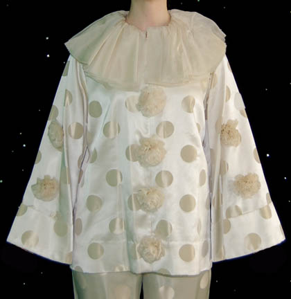 Description: A costume featured in the Star Trek: Voyager episode "Virtuoso" where "The Doctor" (Robert Picardo) becomes an instant celebrity on a planet where music never developed. The costume is a white, polka-dotted, satin clown suit with chiffon collar and "flowers" down the front of the shirt and along the sleeves. The corresponding trousers and conical hat also feature bows but the included shoes do not. The costumer's tag reads ‘Bob Picardo, Doctor, #234 “Virtuoso”, Voyager, Complete Pirot Costume’. One sleeve features a white Velcro placement for the attachment of a Mobile Holographic Emmitter (sold seperately).