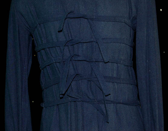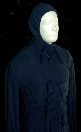 Description: A costume featured in the Star Trek: Voyager episode "Someone To Watch Over Me" for wear by Scott Thompson, of "Kids in the Hall" fame in his role as "Tomin", the Kadi Ambassador. The costume is a navy blue robe with five ties and buttons down the front, a metal clasp on the ties, and corresponding navy blue trousers with a zipper down the back, and a matching ceremonial hood that buttons to the robe. The sewn in tag reads 'Voyager, Scott Thompson'.