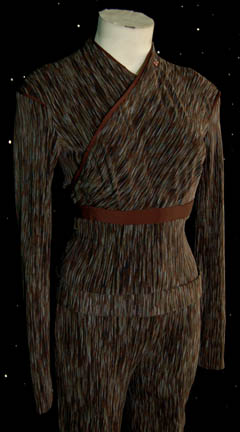 Description: A costume featured in various episodes of Star Trek: Enterprise for wear by Jolene Blalock in the role of “Sub-Commander T'Pol”, the Vulcan science officer aboard the “Enterprise NX-01”. The uniform is the standard 22nd century, type-A, Vulcan military issue which is a full-length jumpsuit of dark-brown color, gray pattern, reddish-brown piping at the collar, on the shoulders, around the waist, and stirrups for the feet. A sewn in tag reads ‘Enterprise, Jolene Blalock”