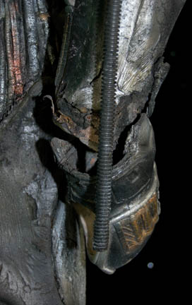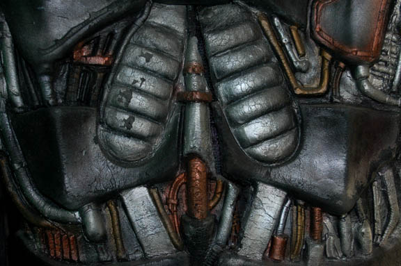Description: A costume featured in Star Trek VIII: First Contact for wear by actors portraying Borg Drones attempting to assimilate the “Enterprise-E” in an effort to stop a pivotal event in human history, First Contact between the Vulcans and Earth in the year 2063. The costume is a pair of overalls with molded foam rubber legs and torso for wear underneath a matching jacket which zips, snaps, and clasps up the spine. The costume is black with metallic silver, gold, and various other colors to appear as ‘cybernetic' armor and it comes with matching shoes. The costume features a placement for a 9.6volt Makita battery which should power untested lights embedded in the costume. A costumer’s tag details the components.