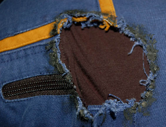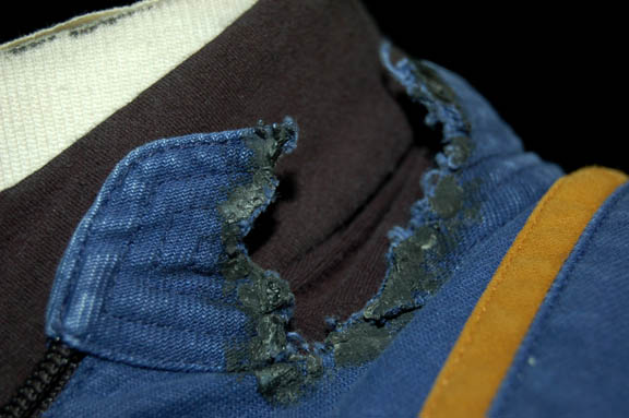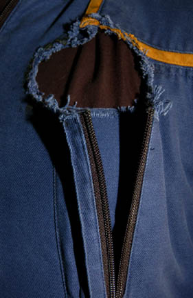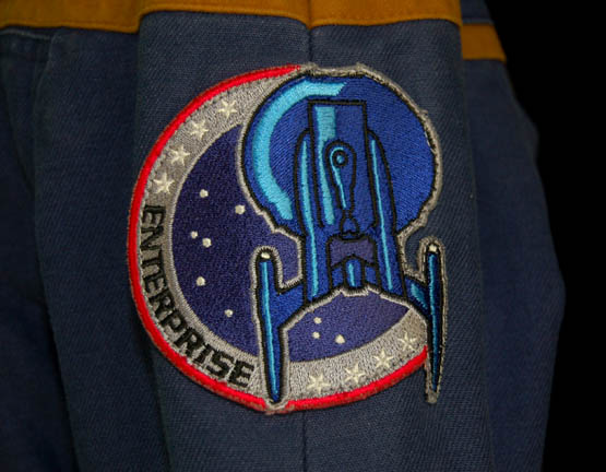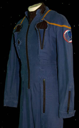 Description: A costume featured in Star Trek: Enterprise episode “Strange New World” where “Enterprise NX-01” crew believe that Sub-Commander “T'Pol” (Jolene Blalock) is conspiring with a race of rock creatures, for wear by Anthony Montgomery in the role of “Ensign Travis Mayweather”, the helmsman of the “Enterprise NX-01”. The uniform is the standard 22nd century Starfleet issue for command officers which is a full-length blue jumpsuit with seven functional, zippered pockets, zipper/Velcrocuff adjustment for the wrists and ankles, Enterprise patch on the shoulder, a black sleeveless undershirt and has been distressed for effect with various tears and ‘burn’ marks. A sewn in tag reads ‘Enterprise, Anthony Montgomery.