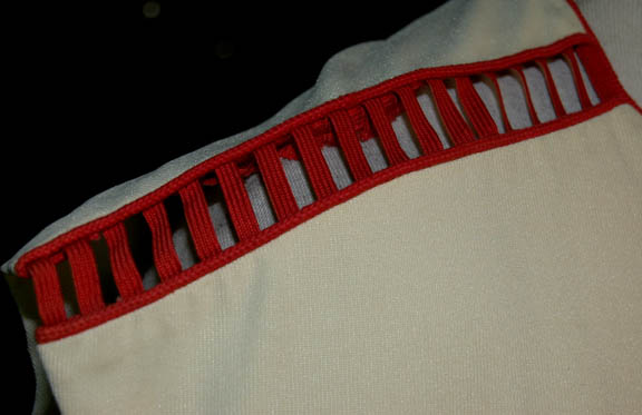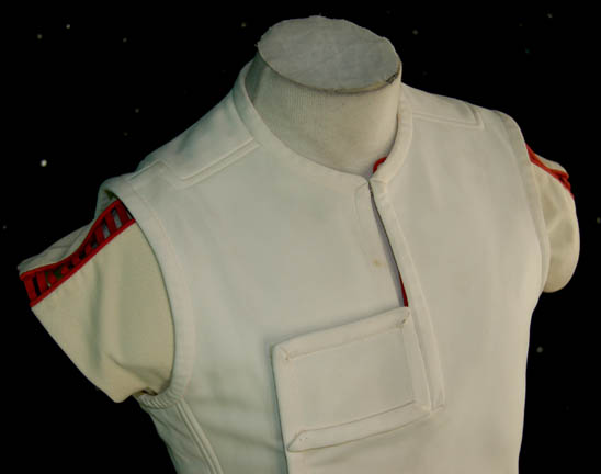 Description: A costume featured in Star Trek II: The Wrath of Khan for wear by Kevin Sullivan in his portrayal of “March”, a Regula I laboratory scientist working in the ‘Genesis Project'. The costume is a sleeveless shirt with a strip of open area across the shoulders and collarbones trimmed with red and held together by red piping. The costume also comes with a researcher vest with an asymmetrical front that zips up the left side and snaps with supplementary Velcro seals. The shirt features a sewn in tag reading ‘Sullivan’ while the vest is nameless.
