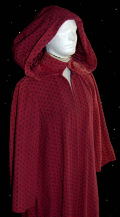 Description: This robe was worn by a “Bajoran Assassin” (Johnny Moran) in the Star Trek: Deep Space Nine episode “Image in the Sand” in which he tried to assassinate “Commander Sisko” (Avery Brooks) to prevent him from finding the Bajoran Orb of the Emissary. The full length hooded robe is crimson with black dashes set in groups of four over its entirety. Due to time and storage there is fading down the left shoulder and part of the hood. Costume comes complete with costume tag.