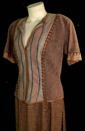 Description: “Lupaza” (Diane Salinger) was a member of the Bajoran Shakaar Resistiance Cell that fought the Cardassians during the Occupation of Bajor and was featured in the Star Trek: Deep Space Nine episode “Shakaar”. The tweed skirt is shades of brown with splits up the sides to the waistband. The front panel of the skirt wraps slightly around the back panel. The top is short sleeved crushed brown leather with a striped fabric panel down the front and back. Leather stitch decorates the cuffs and the front and back panels. Costume comes complete with costume tag. The sewn in tag indicates the costume was also worn by another actress in a Deep Space Nine episode.