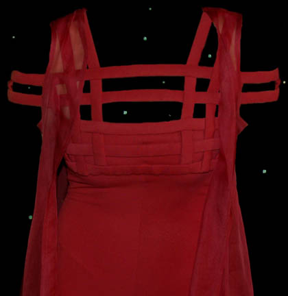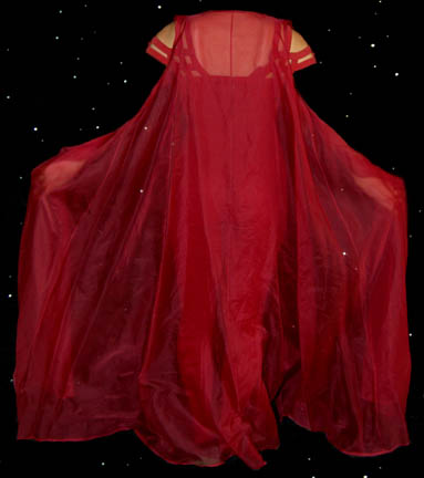 Description: Nidell was the last wife of one of the greatest minds in the Federation; terraformer “Gideon Seyetik” (Richard Kiley). Her alter ego was called “Fenna” (Salli Richardson) who was created when Nidell lost control of her psychoprojective telepathy in the Star Trek: Deep Space Nine episode “Second Sight”. This costume lot includes two crimson jumpsuits from the “Second Sight” episode. They each have built in feet, lattice work across the shoulders and built in push-up bras. Due to time and storage one of the bras is degraded. A single sleeveless crimson chiffon robe is worn over the top. Costume comes complete with costume tag.