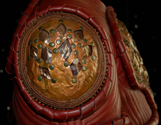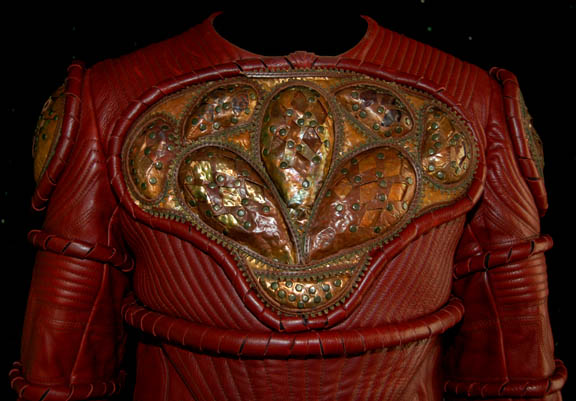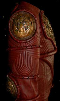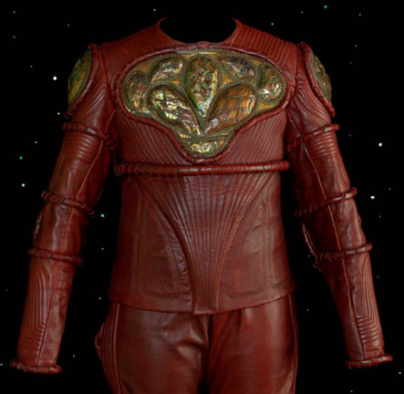 Description: A costume featured in the Star Trek: Enterprise episode “Extinction”, where “Lieutenant Reed” (Dominic Keating), “Ensign Sato” (Linda Park), and “Captain Archer” (Scott Bakula) are infected with a virus that causes them to evolve into aliens native to the planet they are visiting. The aggressive virus has been contained by aliens, this costume is for wear by Roger Cross in the role of the commander of the containment forces “Tret”. The costume is a long sleeved red leather jackets with decorative stitching, more leather piping, intricate copper metal work on the chest and both shoulders, and a zip down the back. The corresponding red leather, overall style trousers have reinforced knee pads, a zipper down the back, and matching red leather boots. A sewn in tag reads ‘Enterprise, Roger Cross #55' and a costumer’s tag reads ‘Enterprise #055 Extinction, Tret, Roger Cross’.