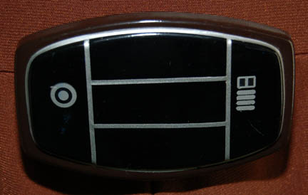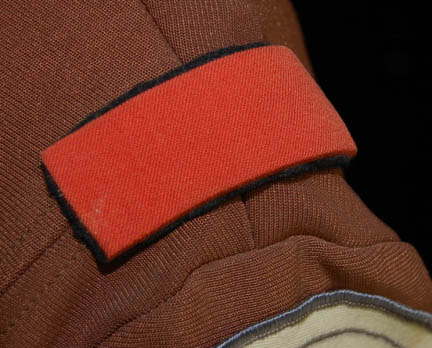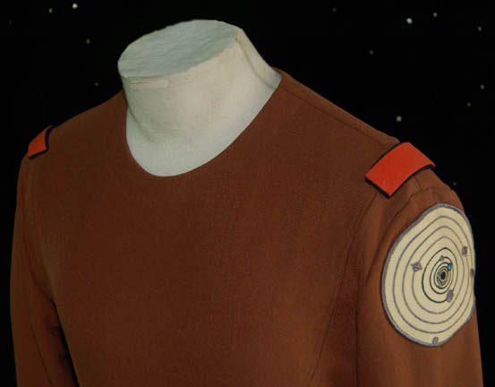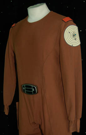 Description: A costume featured in Star Trek I: The Motion Picture, a brown Starfleet Class-D jumpsuit with attached shoulder division strips colored orange, an affixed Earthbase shoulder patch on the left sleeve depicting the solar system and the planets orbits, and an attached plastic bio-monitor. The costume is intended for male actors.